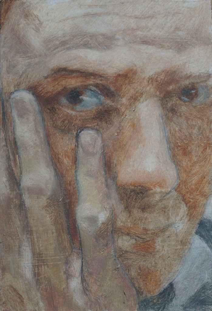 Self Portrait with Hand, oil on board, 15 x 10 cm